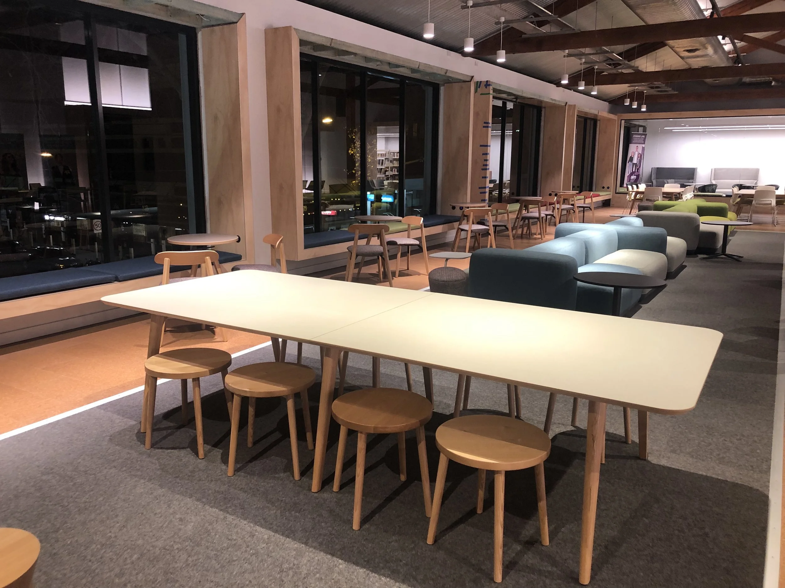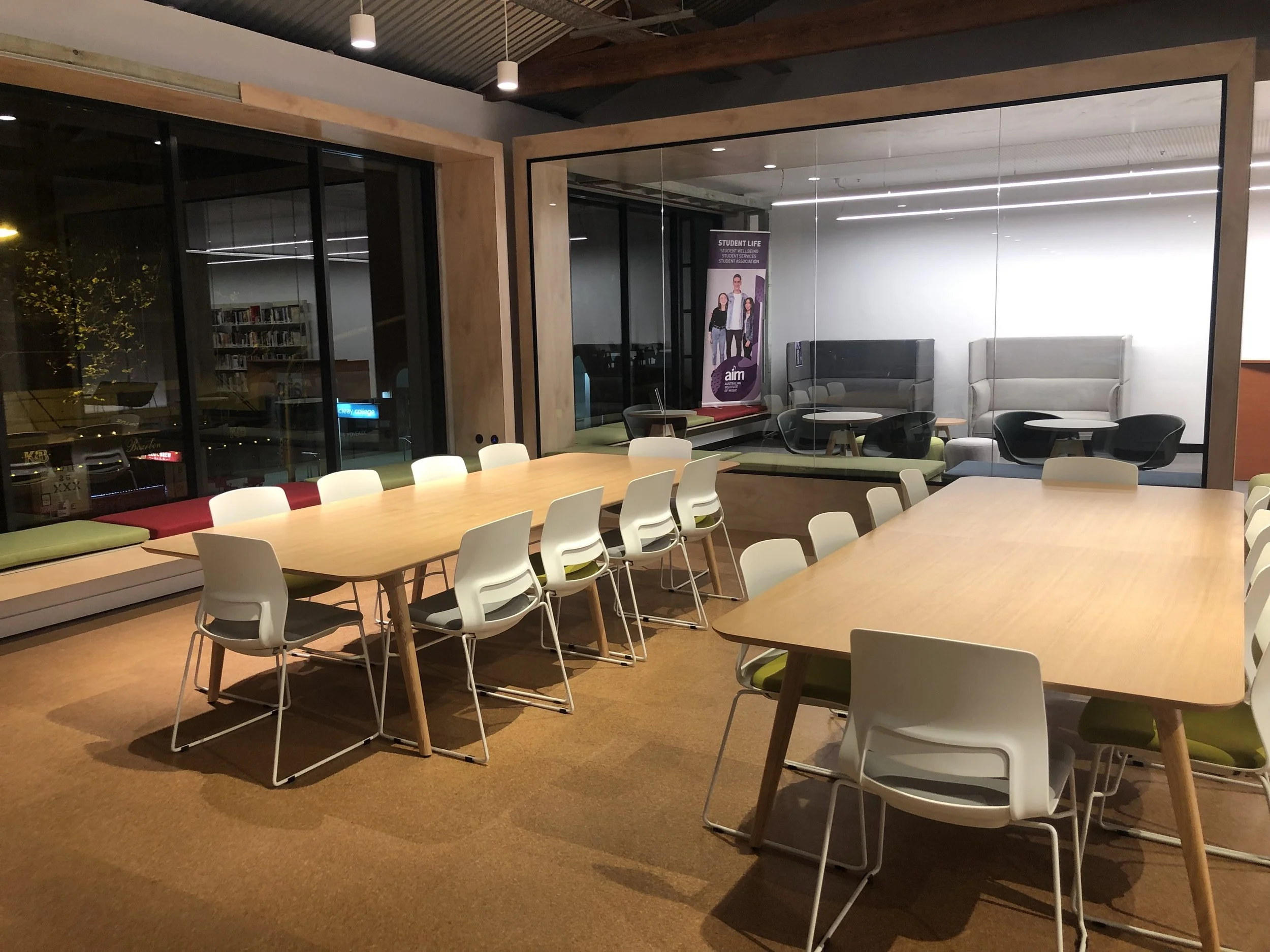 The finished space is a seamless blend of design and utility, providing students with a colourful and engaging atmosphere that supports and elevates their higher learning experience. This project stands as a testament to how thoughtful design can transform educational spaces into vibrant hubs of creativity and collaboration.